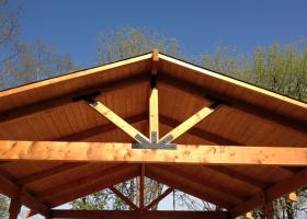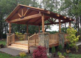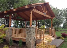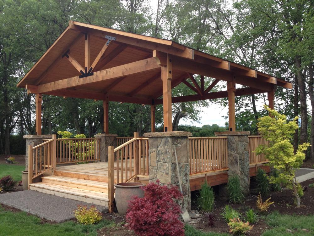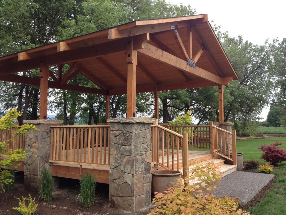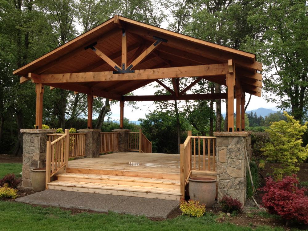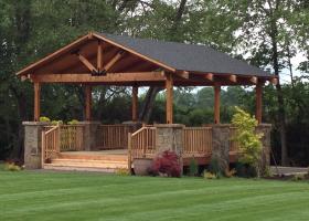 A gazebo is a pavilion structure, sometimes octagonal or turret-shaped, often built in a park, garden or spacious public area.[ Gazebos are freestanding or attached to a garden wall, roofed, and open on all sides; they provide shade, shelter, ornamental features in a landscape, and a place to rest. Some gazebos in public parks are large enough to serve as bandstands or rain shelters.